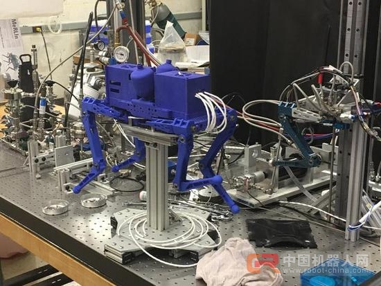 MeRLIn由矩形管和第十代狗关节腿构成,然后装置在滑动铝支柱上。旁边的深蓝色3D打印模块显示其完成时的状况:无头的四腿机械,体型与约克郡梗相当。然则当这个项目标工程师启动它停止演示时,我看到他们为什么爱好将MeRLIn打造为松鼠形状了。固然它应用小型马达和液压驱动活塞,但它却能跳得异常高。