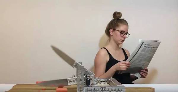 别的,MegaBots 还以瑞典女创客Simone Giertz 的切菜机为灵感,为Mark III 型机械人装上了两把巨型的刀子,而且让Simone Giertz 亲身操作,切碎了一台洗衣机、一间小板屋、一架钢琴……