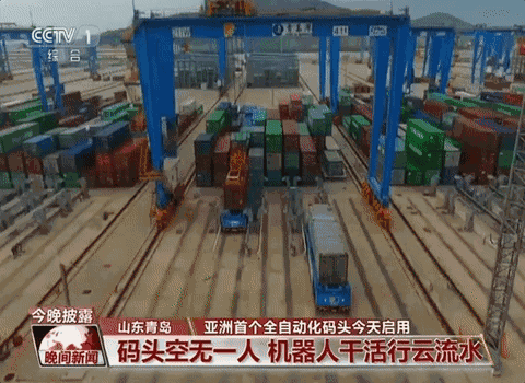 船埠空无一人 机械人干活行云流水