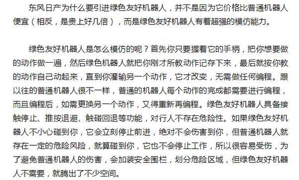 春风日产所界说的绿色友爱机械人是如何的呢?"绿色"寄意能耗低,环保,智能;"友爱"寄意与人协同协作,可依照分歧的功效需求完成零部件的抓取、运输和装置等操作。