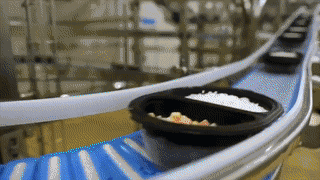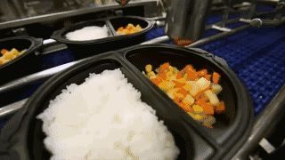 经由漫长的传输带之旅(能够是为了让米饭充足散热),封装,这份“新颖”的肉丸饭就做好了…