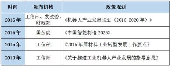中国为了优化工业机械人家当构造和家当完成进级,从2013年到2016年推出了一系列相干家当政策。例如,在2013年,工信部宣布政策《关于推动工业机械人成长的指点看法》;在2015年,国务院宣布政策《中国制作2025》;2016年工信部、发改委、财务部宣布政策《机械人家当成长计划(2016-2020)》。这些政策明白指出,机械人家当与制作业有互相影响的主要性,将来智能制作将作为中国制作业成长的重点成长范畴,从而推进经济增加。