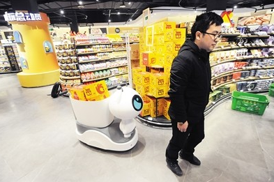运货机械人可以随着顾客购物。 本报记者 李斌 摄