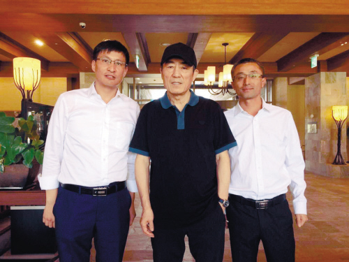 沈阳新松挪动机械人BG总裁张雷(左)、挪动机械人BG总工程师刘俏(右)与张艺谋合影
