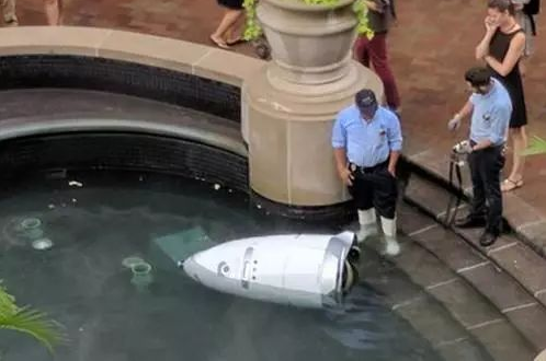 美国一安保机械人冲到了喷泉池中