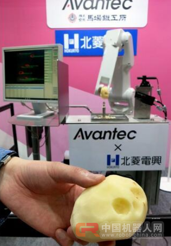 在往届国际食物工业展上,日本石川县的马场铁工所加工场展出了能挖去土芽菜的机械人。这款机械人可以用机械手捉住土豆,然后应用激光和摄像头定位抽芽的地位,最初拔动身芽的部门。