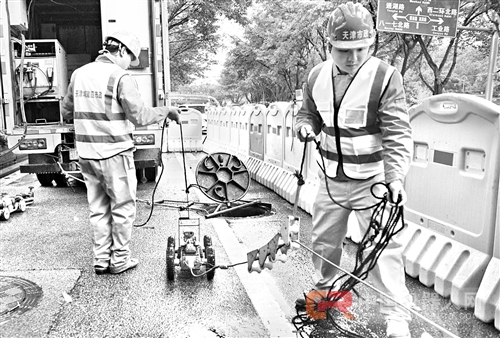 昨日,福州市水务团体施工队离开湖滨路西门公交站邻近,该路段位于西湖畔,车辆交往多,交通压力年夜。施工现场,记者并未看到年夜型器械开挖,并占用年夜面积路面,施工人员只是用水马离隔了部门路面。记者看到,一个机械人从翻开的井盖进上天下管道,检讨管道受损情形,与此同时,路面的电脑显示屏上,能看到管道涌现渗漏。因沿路栽种的榕树根系蓬勃,乃至钻进了管道,招致管道破损加重。