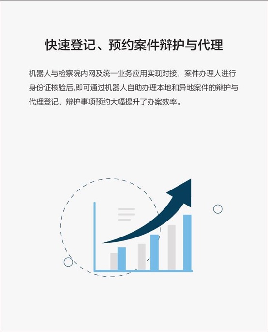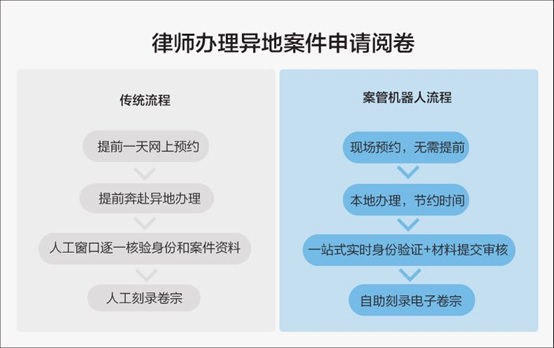 案管机械人特别为异地办案带来诸多便捷:以律师预定请求阅卷为例,以往律师解决异地案件请求阅卷时,须要提早一天经由过程案件信息地下网、微信、网上信访年夜厅等渠道停止预定,填录案件称号、解决审查院、请求物证件号等信息,并上传相干身份资料,预定胜利后再亲身前去案件受理地审查院预定检查。如今有结案管机械人,律师只需在本地审查院经由过程机械人摄影收集律师执业证、拜托书等资料,再推送给案件受理地审查院案管部分停止线上及时审核,审核经由过程,就可以从案管机械人上疾速刻录电子卷宗,而不用再到异地解决。同时,对审查机关而言,用机械人停止材料核验和自助刻录电子卷宗,也年夜年夜勤俭了人力本钱,可以或许减缓审查机关终年人少案多的抵触。