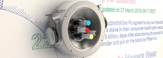 Scribit是一种智能绘画机械人,它可以在任何垂直的外面绘制和抹去图象,从白板到玻璃或灰泥,它将墙体转换成“屏幕”,在“屏幕”上投射出画作、新闻或信息。