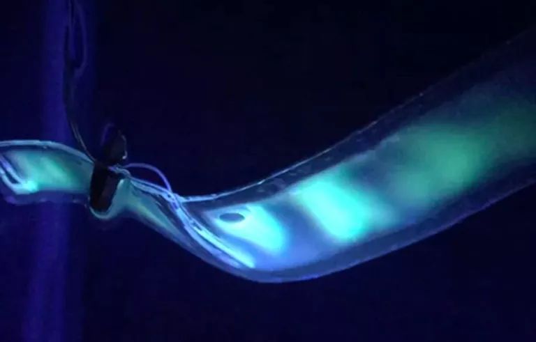 这只机械人由加利福尼亚年夜学的工程师和陆地生物学家配合开辟,机械人全长30cm,通体呈半通明的状况,由充斥水的天然肌肉和简直通明的电子版组成。