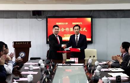 施耐德电气工业事业部计谋和营业成长部司理陈斌与南通职业年夜黉舍长马成荣代表两边签约