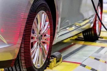 总卸车间里另外一个具有“3D”概念的是总装检测线。据泛亚工程师引见,这里的四轮定位装备采取非接触式3D激光头 行检测,其检测精度远远高于之前的2D激光头,并实用于上海通用现有全系车型的检测任务。
