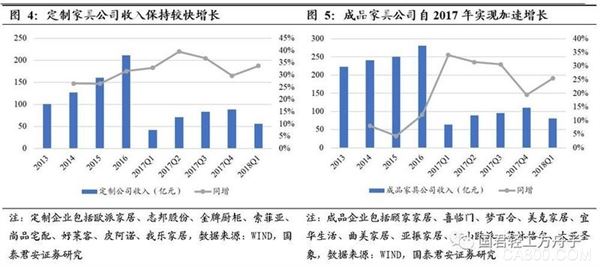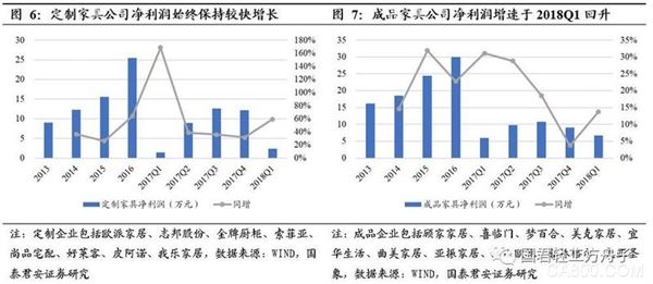 分季度来看,Q3、Q4涌现显著下滑,2018Q1增速恢复至13.76%。我们断定在阅历了定制企业几年的持续冲击后,制品公司对其定位和结构慢慢作出调剂,拉宽价钱带、扩大品类、增长工程等渠道,使支出恢复到了疾速增加。