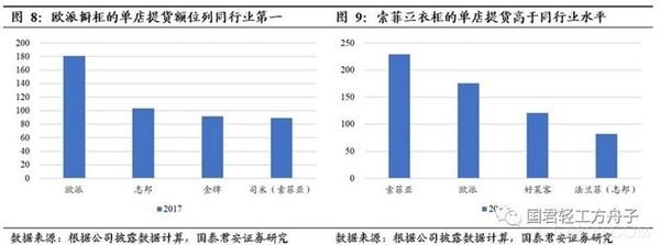 从终端门店运营来看,欧派橱柜单店提货额位列同业业第一,2017年单店均匀提货额约为180万/家;索菲亚的衣柜单店表示最好,2017年接近230万/家。