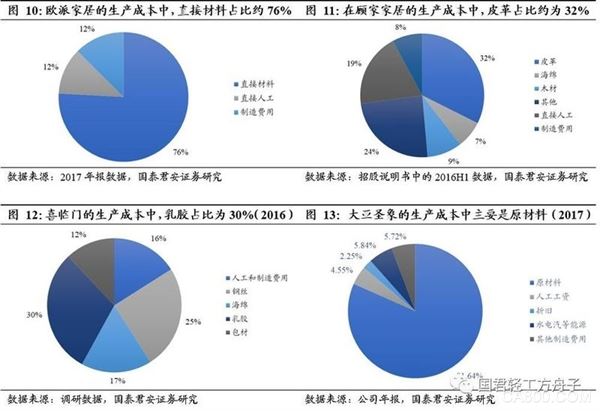 在典范的家具企业中,直接资料占比绝对较高,个中定制家具企业的重要用材为刨花板等板材和五金等资料,而软体家具的本钱重要来自于海绵、皮革、木材等。
