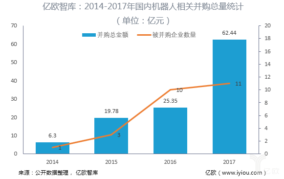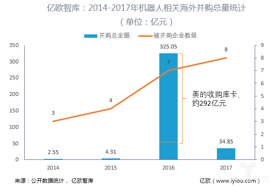 国际机械人相干收买方面,据亿欧智库统计,相干并购根本从2014年开端,截止2017岁尾,机械人相干上市公司收买(收买50%以上股权)其它企业或其它上市公司收买工业机械人公司共产生25起,算计投资约114亿元。个中,年夜部门收买产生在2016和2017年,分离是10和11起。从收买数目看,2016年开端,机械人相干收买开端低落,并在连续成长。
