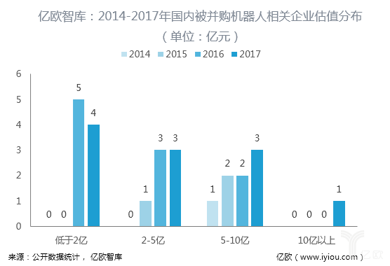 固然数目很多,然则被收买企业的估值其实不高。2016年之前的并购估值广泛低在数亿元,以后,固然整体绝年夜多半被收买企业估值依然不高于10亿元,不外5-10亿元的企业数目在随时光上升。比拟于今朝许多创业公司在B轮支出很少,却动辄数亿美元的估值,很多工业机械人年支出几万万,估值只要几亿元,市销率PS很低,这能够与工业机械人市场缺少想象力有很年夜关系。假如坚持这个PS值,很多今朝A轮融资的企业将来假如被收买,能够产生二级市场估值低于一级市场的估值倒挂。