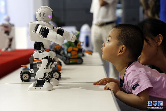 5月25日,世界制作业年夜会上,一位儿童正在与机械人互动。新华网 陈扬 摄
