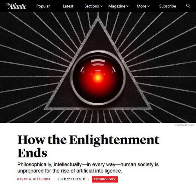 美国前国务卿、交际家、国际成绩专家亨利·基辛格在2018年6月号美国《年夜西洋月刊》杂志刊发评论文章:《发蒙若何终结》。他以为,“不管从哲学层面来讲,照样从人类智力层面来讲,甚至从每个层面下去说,人类社会还没无为人工智能技巧的突起做好预备”。