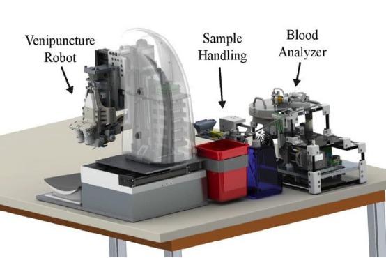 罗格斯年夜学的研讨人员研发的机械人装备由三个子体系构成。起首是机械人静脉穿刺装备,它应用近红外和超声成像来定位血管,应用图象剖析来3D重建血管,然后小型化的机械人将针放置在指导血管的中间。一旦收集了血液样本,它就会经由过程一个样本处置模块被移至一个剖析仪。这一部门的子体系应用微型离心计心情和显微镜停止血液丈量。今朝,它可以履行三分类白血细胞差别和血红卵白丈量。