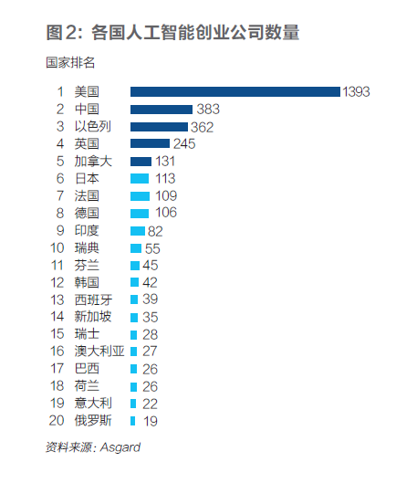 德国AI风投基金Asgard近期宣布的申报显示,今朝全球共出现了3600余家AI创业公司,个中美国有1393家,占比40%;中国有383家,占比11%,以色列有362家,占比10%。