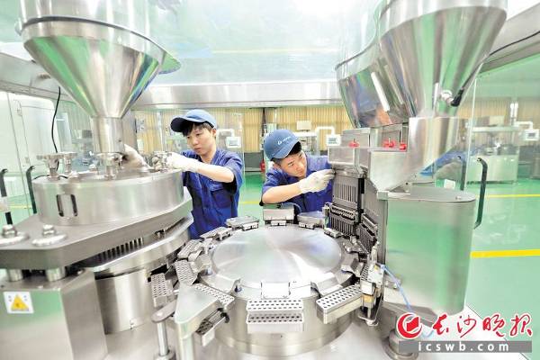 在楚天科技智能医药设备家当园,两名工人正在组装调试全主动智能硬胶囊充填装备。 长沙晚报记者 王志伟 摄